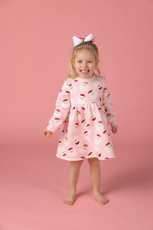 Brushed French terry long sleeve sweatshirt dress features cotton rib neckline and sleeve openings.